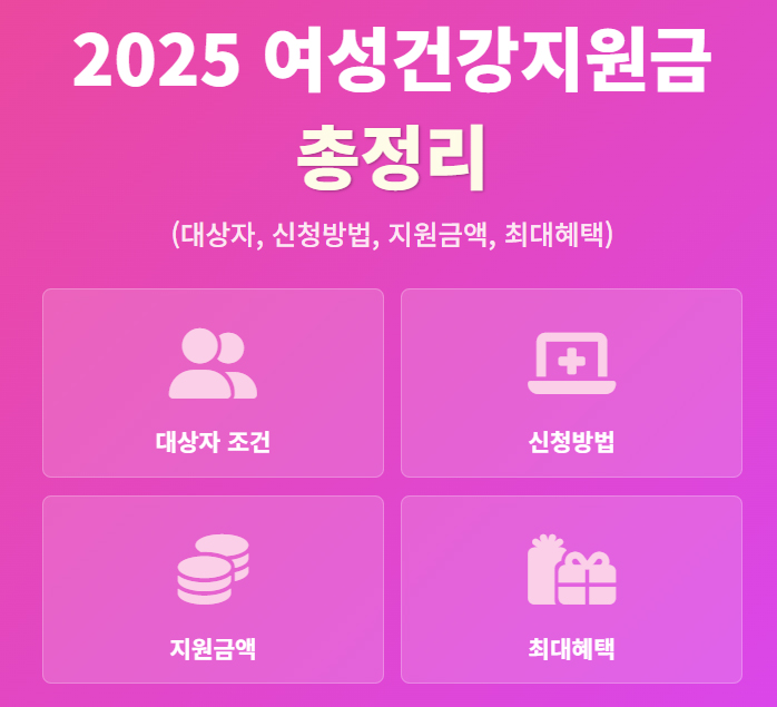 2025년 여성건강지원금의 모든 것! 임신준비(난임), 산후조리, 여성청소년 생리용품 지원 등 대상자 조건, 신청 방법, 지원 금액을 총정리했습니다. 특히 내가 사는 지역의 추가 혜택을 확인하여 최대 혜택받는 꿀팁까지 놓치지 마세요!
